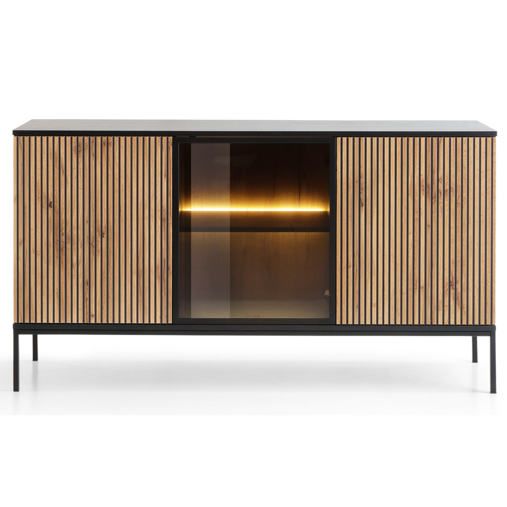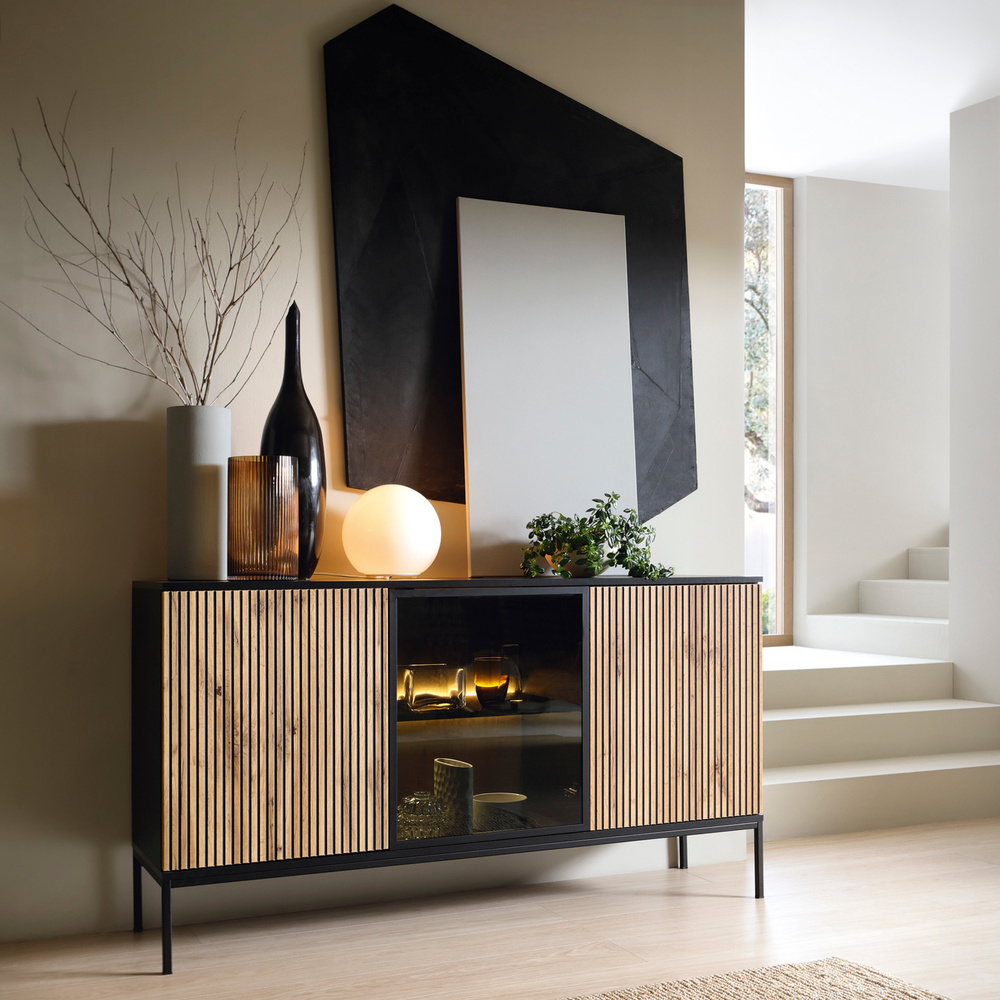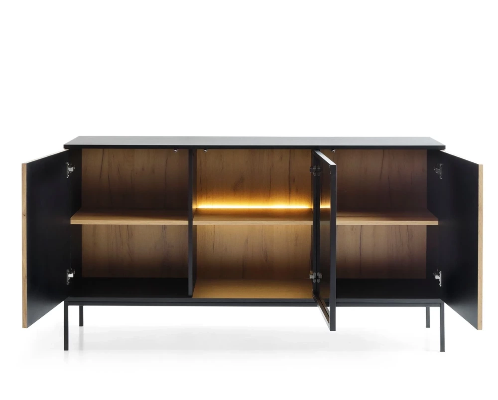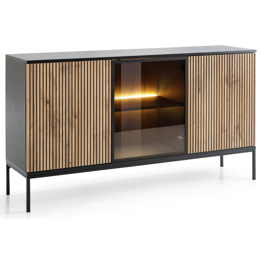 SENTOCCI kolmiovinen lipasto, jossa on LED-valaistus on oikea huonekalu niille, jotka rakastavat teollista tyyliä ja hieman lämpöä. Nykysuuntausten mukaisesti huonekalut ovat jyrsittyjä etulevyjä joka antaa virastolle design-ilmeen. Kaunis aksentti on lasinen etuosa jonka takana on LED-valaistus lämpimällä valolla, joka korostaa lipaston syviä värejä ja hyllylle asetettuja koristeita. Meillä on yhteensä kuusi tilavaa hyllyä, joihin voimme sijoittaa koristeita, matkamuistoja ja kokoelman lempikirjojamme. Laatikolle luonteenomaista, hienovaraisuutta ja vakautta lisäävät jauhemaalatut laatikostot mustat metallijalat. Kolmiovinen lipasto on valmistettu seuraavasta materiaalista 16 mm:n laminoidusta levystä ja MDF-levy.