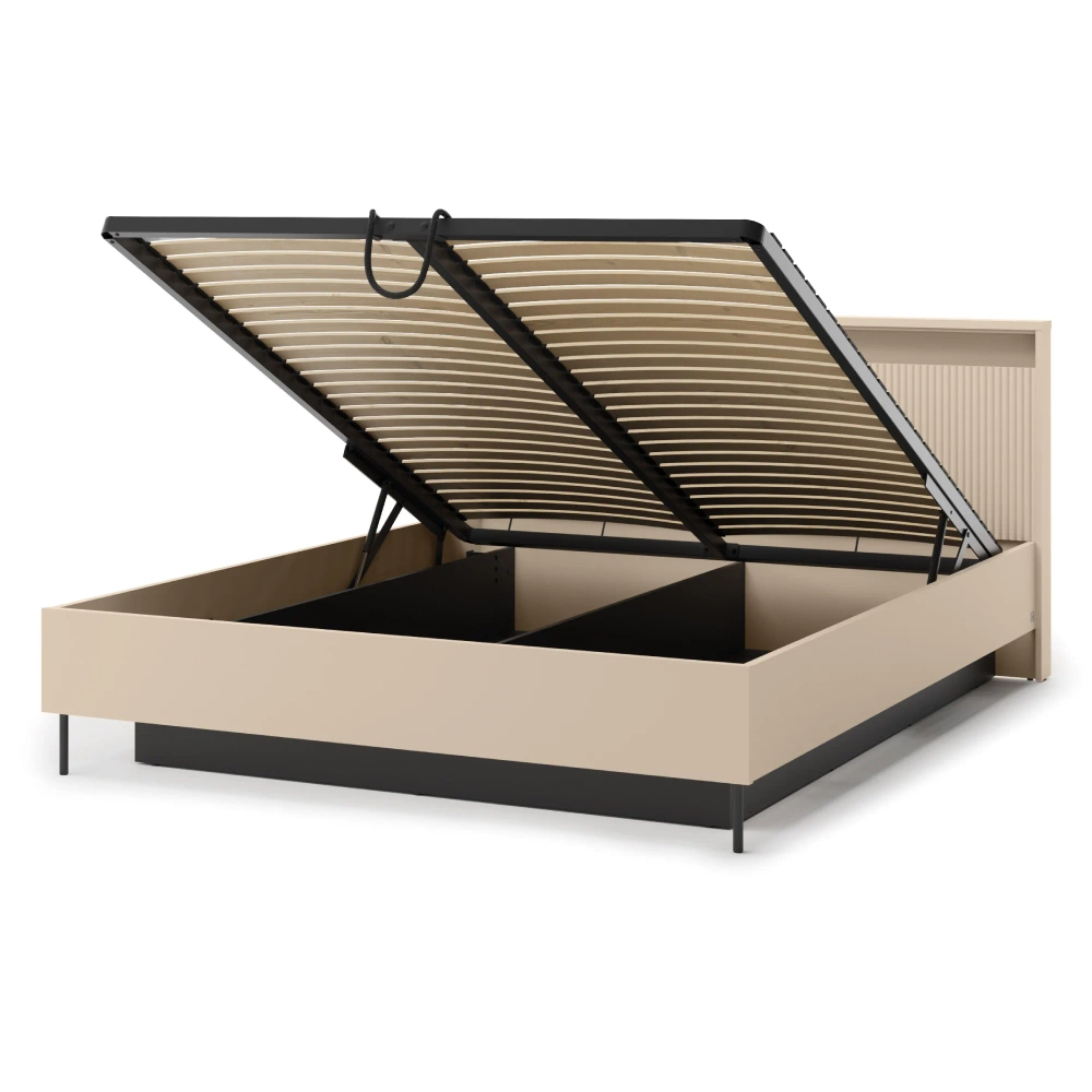 Sängyssä on vankka runko, joka takaa patjalle riittävän tuen. Makuutilan koko on 180x200 cm. Lisäetu on tilava säilytystila, johon voi säilyttää erilaisia tavaroita, kuten vaatteita, urheiluvälineitä, vuodevaatteita ja monia muita tarpeellisia esineitä. Sängyn rungon ja patjan avaaminen on erittäin helppoa ja kevyttä sisäänrakennettujen kaasujousien ansiosta. Sängyn modernia ulkonäköä korostaa vaikuttava LED-valaistus, joka on sijoitettu päätyyn ja luo tunnelmallista valoa sekä toimii yöpöytälampuna.