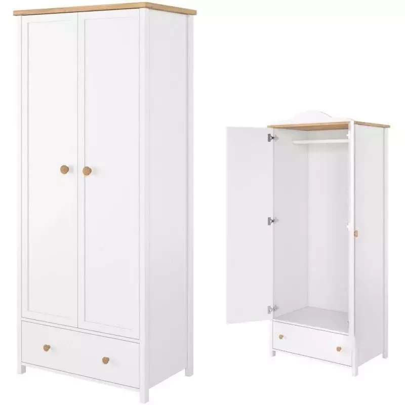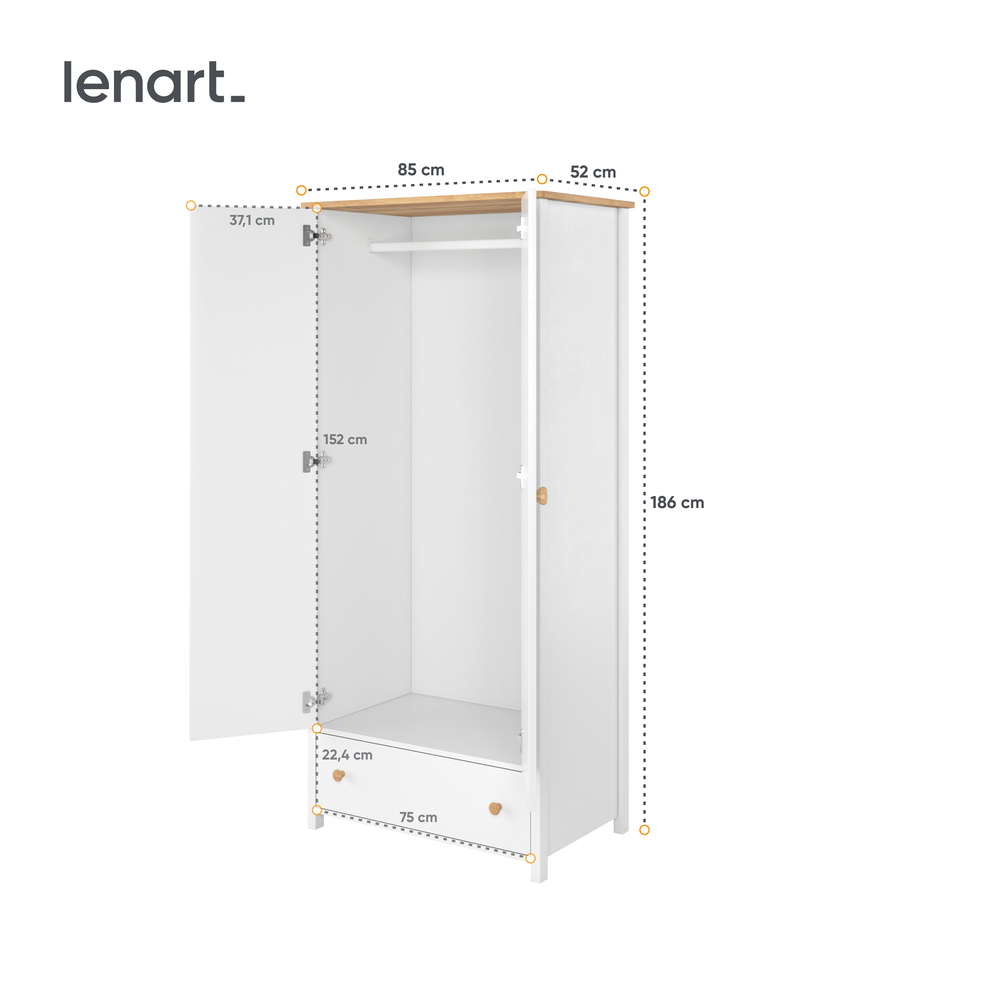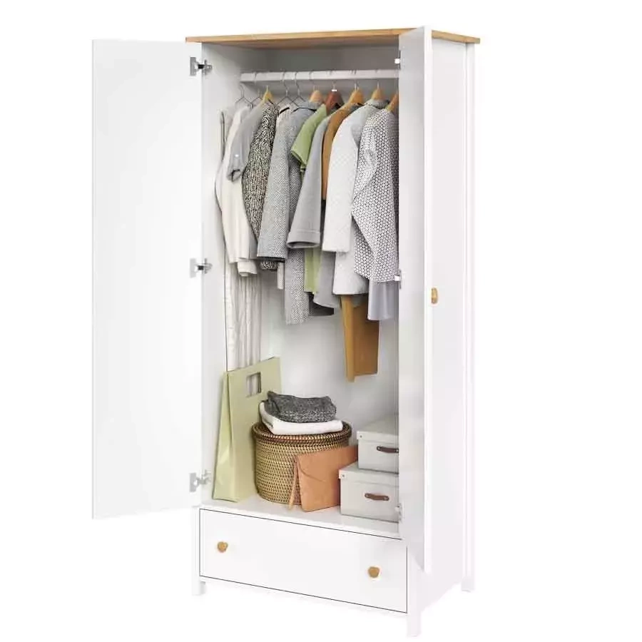 Kapea vaatekaappi STORYn avulla voit järjestää sisustustilan toiminnallisesti ja kauniisti. Valkoinen runko, jossa on puun värinen yksityiskohta, monipuolistaa sisustusta mielenkiintoisesti ja tuo huoneeseen lämpimän tunnelman. Tuotteemme sopii täydellisesti pojan ja tytön huoneeseen. Lisäksi se sopii myös aikuisten makuuhuoneeseen, joka on sisustettu skandinaaviseen tyyliin. Koko huonekalu perustuu kestäviin jalkoihin, jotka takaavat turvallisen käytön ja vakauden. Tilava syvennys tilava syvennys ja pitkä palkki sisäpuolella on tilaa eripituisten vaatteiden ripustamiseen ja ulosvedettävä laatikko varmistaa, että voit helposti säilyttää siinä muita vaatteita, henkilökohtaisia rihkamaa tai lapsesi leluja.