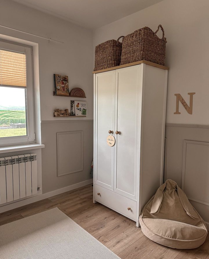 - kestävä valkoinen vaatekaappi yhdistettynä puunvärisiin yksityiskohtiin luo viihtyisän kokonaisuuden sisustukseen
