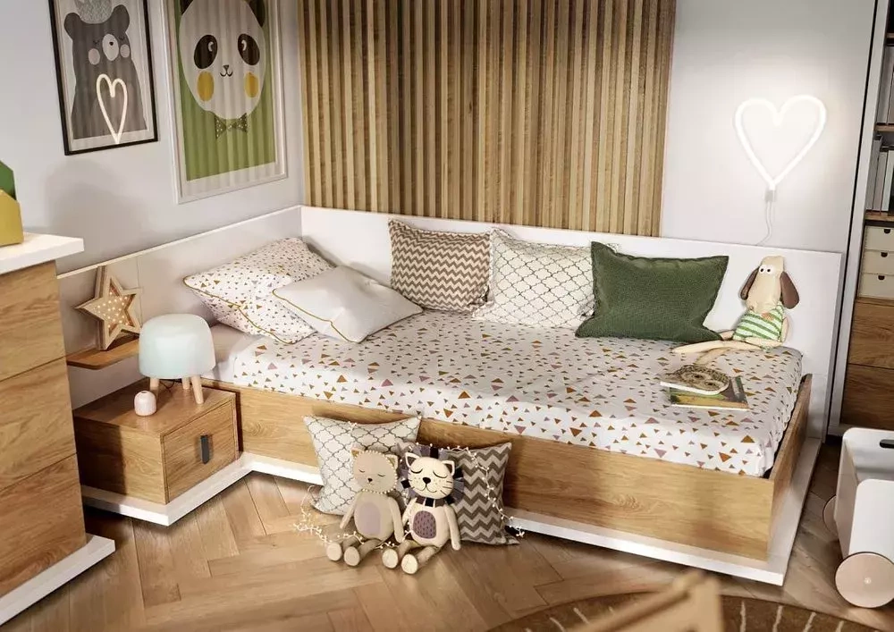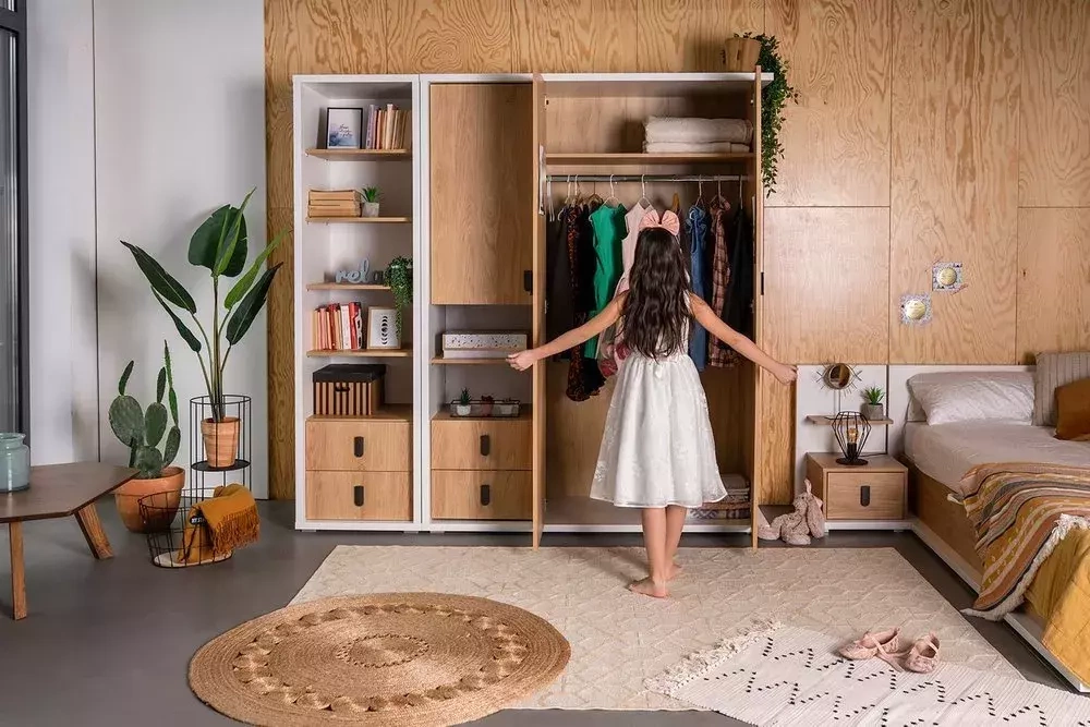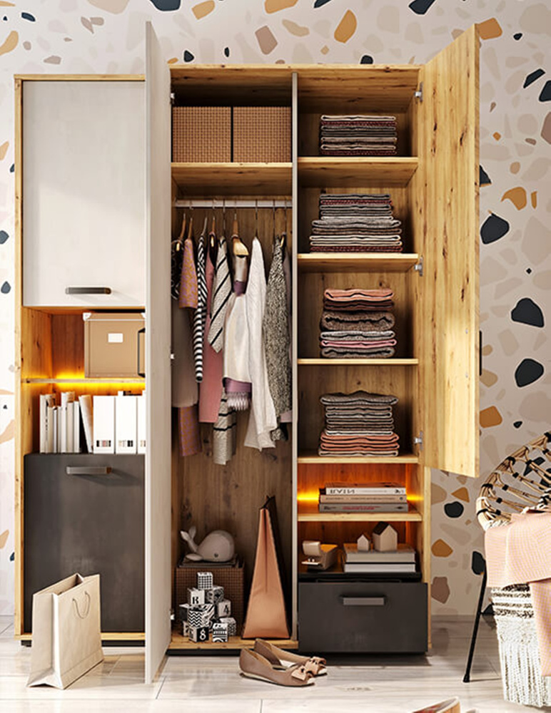 Huonekalujen tyylissä yhdistyvät kiinnostavalla tavalla nykyaikaisuus ja ripaus perinteitä. Valkoisen ja lämpimän puun värin ajaton yhdistelmä saa vaatekaapin luomaan viihtyisän tunnelman mihin tahansa sisustukseen. Muodikas, massiivinen runko herättää huomiota. Etuosat ovat runkolinjan alapuolella.
