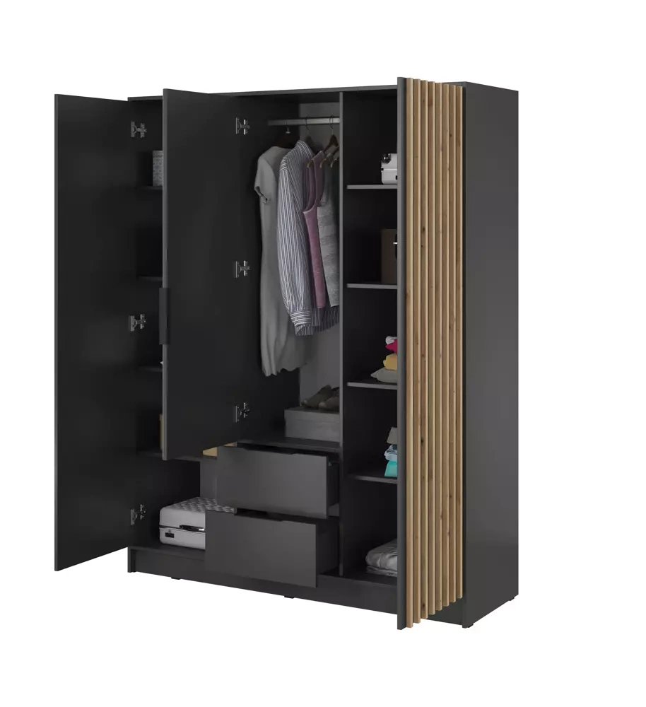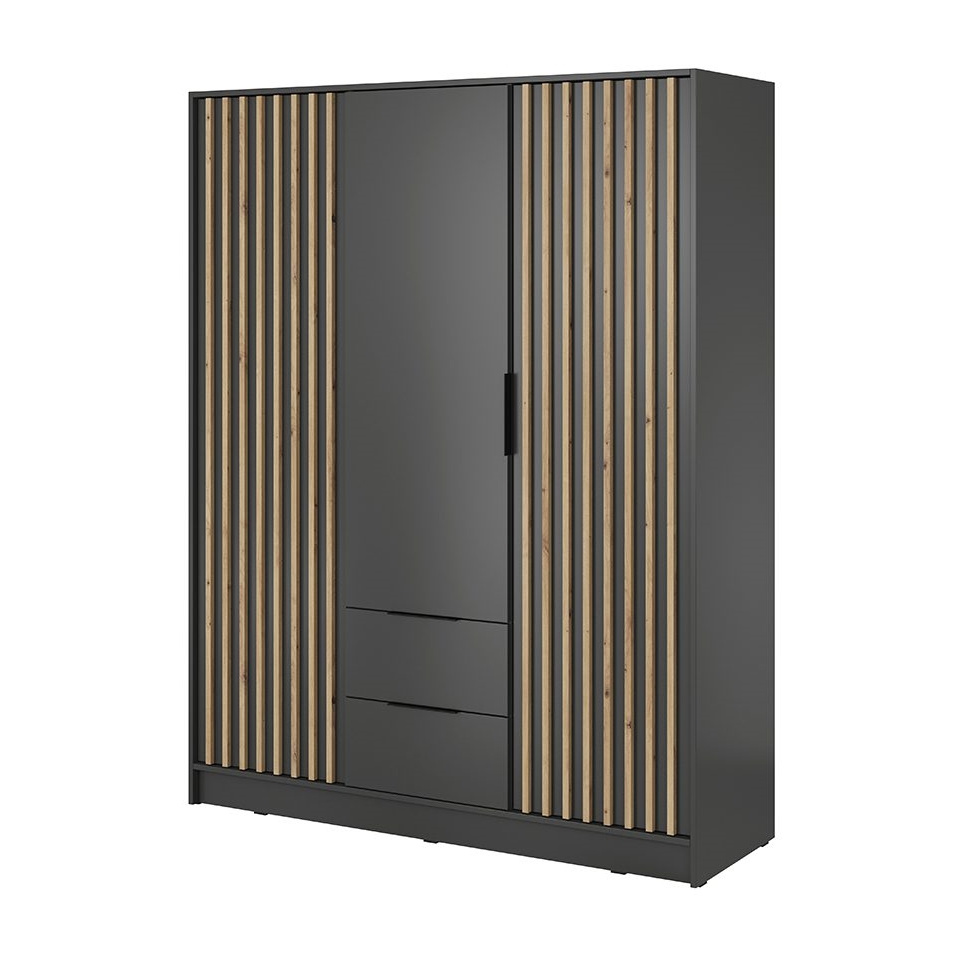 Nelly vaatekaappi on täydellinen ratkaisu ihmisille, jotka arvostavat yksinkertaisuutta ja tyylikkyyttä. Vaatekaapit sopii erinomaisesti erilaisten vaatteiden säilytykseen, myös ripustettavien vaatteiden säilytykseen. Vaatekaapin leveys on 155 cm. Vaatekaapin sisätilat on jaettu kolmeen eri alueeseen: ensimmäinen koostuu tilavista hyllyistä ja vaatekiskosta vaatteiden ripustamista varten. Seuraavat kaksi vyöhykettä koostuvat monista hyllyistä. Nelly-vaatekaappi on erittäin toimiva ja tilava. Hyllyjen korkeus on säädettävissä, mikä mahdollistaa myös vaatekaapin räätälöinnin entistä paremmin tarpeisiimme. Avattavat kahvat ovat mustaa metallia. Kolmioviset vaatekaapit, joissa on uurrettu panelointi Nelly rungot ja etuosat on valmistettu korkealaatuisesta laminoidusta levystä, joka kestää likaa ja naarmuja. Lisäksi kaikki reunat on päällystetty ABS-reunuksella.
