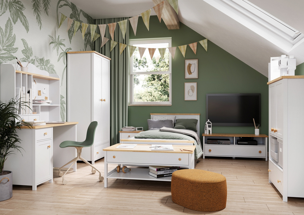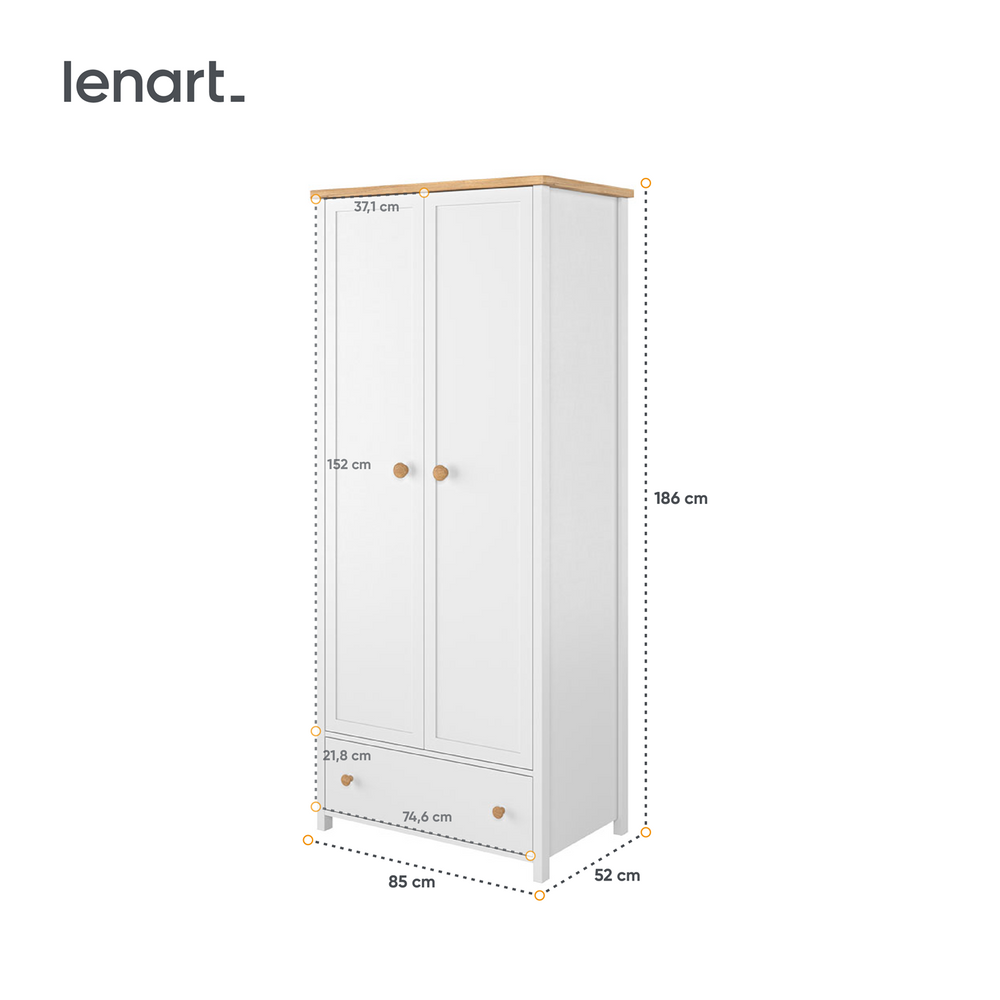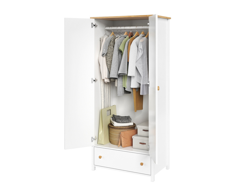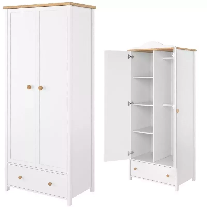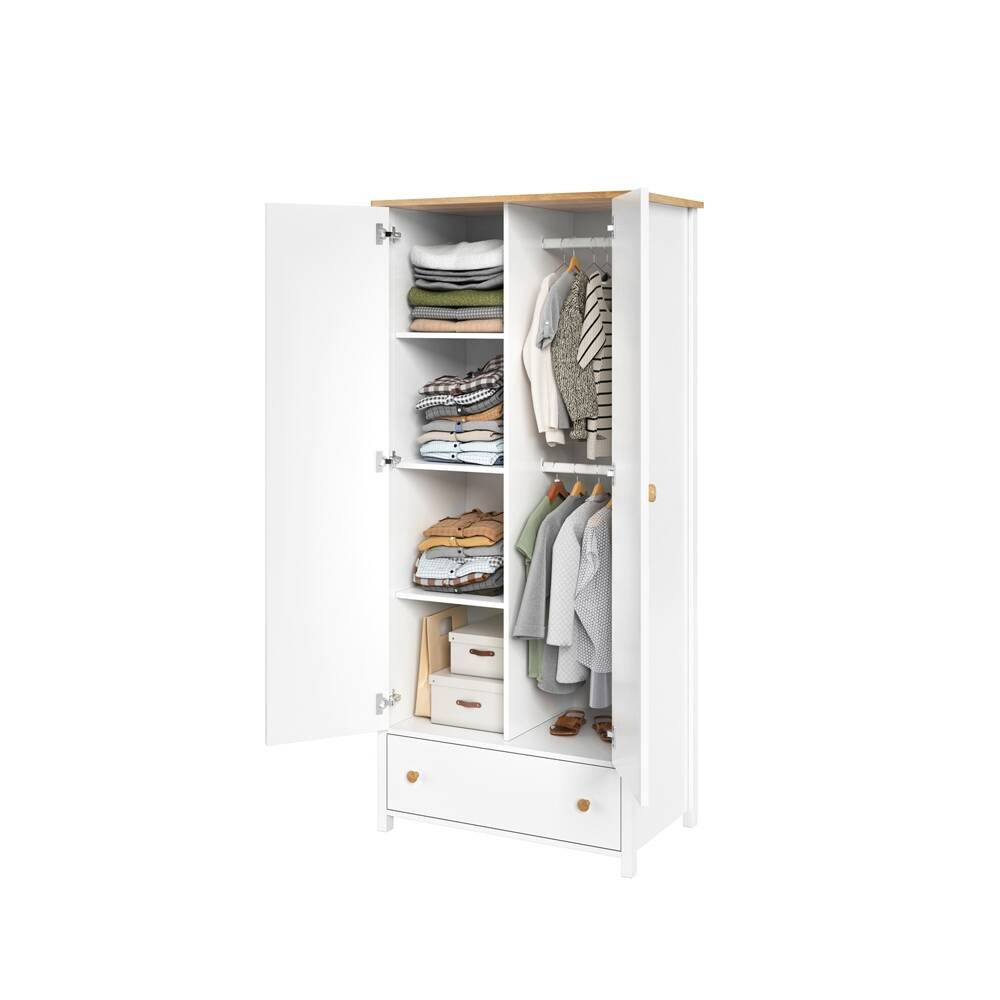 Tilava tilava vaatekaappi voit järjestää lastenhuoneen tai makuuhuoneen tilan toiminnallisesti ja kauniisti. Valkoinen väri ja Nash-puun väriset yksityiskohdat monipuolistavat sisustusta mielenkiintoisella tavalla ja luovat sisätiloihin visuaalisen lämpimän ilmapiirin. Tuotteemme on niin universaali, että se sopii täydellisesti tyttöjen ja poikien huoneisiin. Koko huonekalu perustuu kestäviin jalkoihin, mikä lisää käyttöturvallisuutta ja vakautta. Tilava hyllyt vaatekaapin sisällä olevat kaksi kompaktia tankoa tarjoavat tilaa eripituisten vaatteiden ripustamiseen, ja ulosvedettävä laatikko takaa, että voit helposti säilyttää siinä muita vaatteita, henkilökohtaisia rihkamaa tai lapsesi leluja.