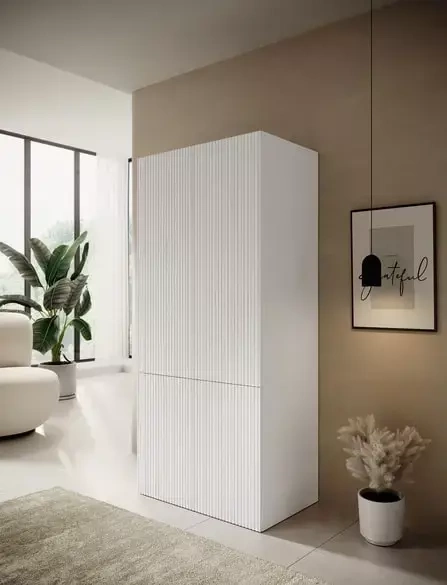 The 90 cm valkoinen vaatekaappi viitataan merkittävästi nykyisiin suuntauksiin. Tässä epätavallisessa huonekalussa on houkutteleva, geometrinen muoto. Julkisivu on peitetty friisien muodossa olevilla koristeilla. Tämä ratkaisu tekee rakenteesta erittäin houkuttelevan ja modernin näköisen. Kapea vaatekaappi vie vähän tilaa, mahtuu pieneen huoneeseen tai käytäväänkin. Huonekalussa on 2 etupuolta, jotka avautuvat sivuille, joissa on PUSH-CLICK-järjestelmä. Kaksi hyllyä mahdollistaa erilaisten lisävarusteiden järjestämisen. Voit ripustaa tyylikkäitä vaatteita henkareihin tilavassa tilassa, joka on varustettu erityisellä baari. Tämän ansiosta voit helposti valita asun tärkeälle retkelle, mikä lyhentää valmisteluun tarvittavaa aikaa!