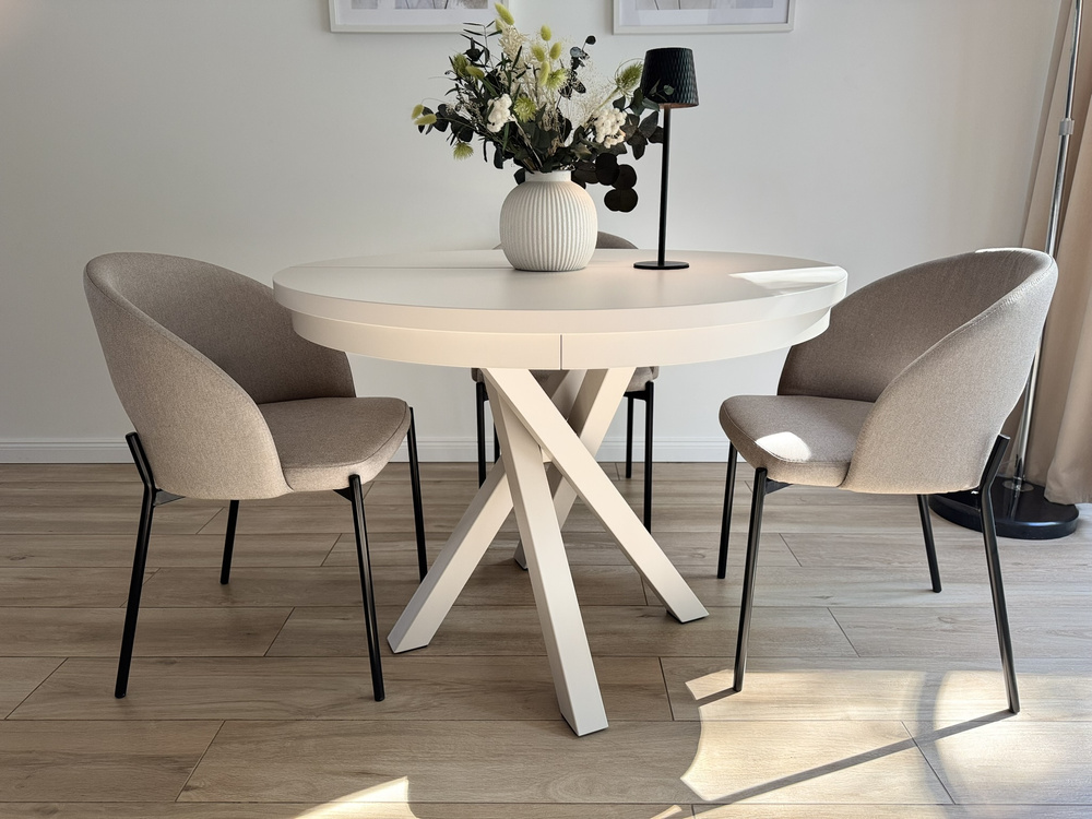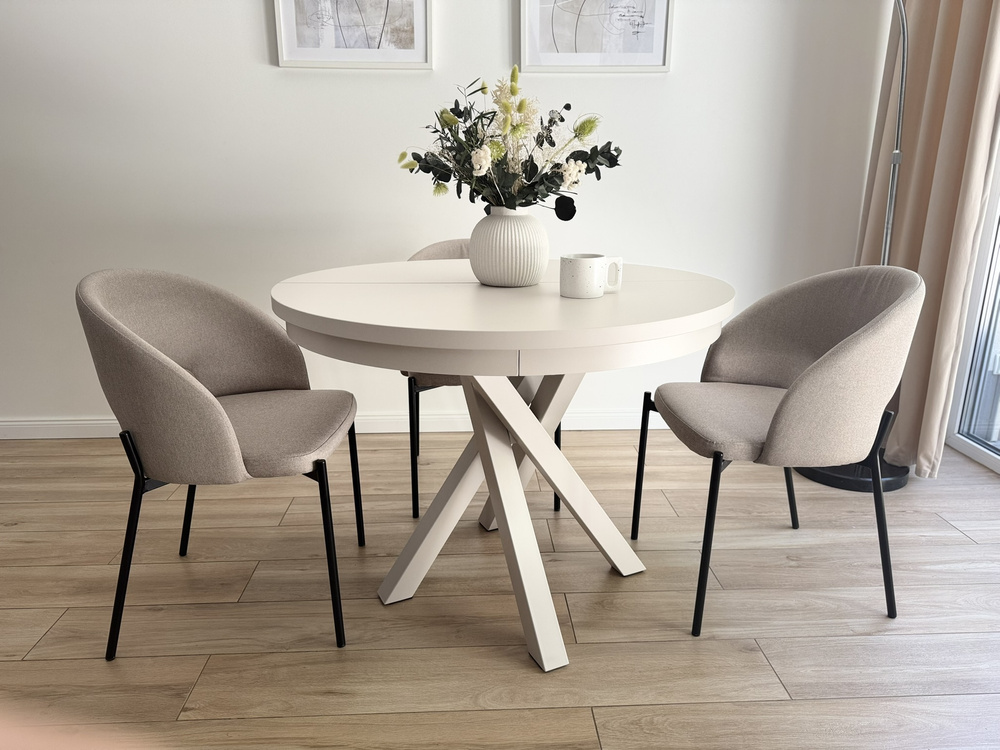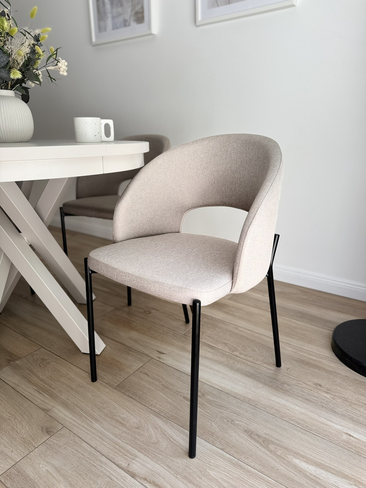 Tyylikäs käsinojallinen tuoli sopii täydellisesti moderniin sisustukseen. Varastettu on valmistettu korkealaatuisista materiaaleista, joten se kestää vuosia. Selkänoja ja istuin on päällystetty mukavalla, vaalealla kankaalla, joka kestää kulutusta ja haalistumista. Runko ja jalat on valmistettu pulverimaalattua terästä joka antaa tuolille vakautta. Alkuperäinen profiloitu selkänoja ja pehmeä pehmuste parantavat istuinmukavuutta merkittävästi.