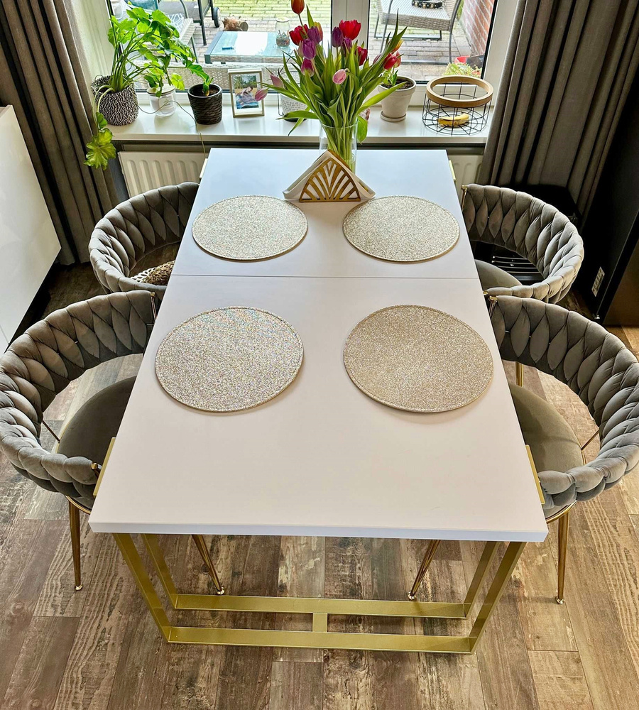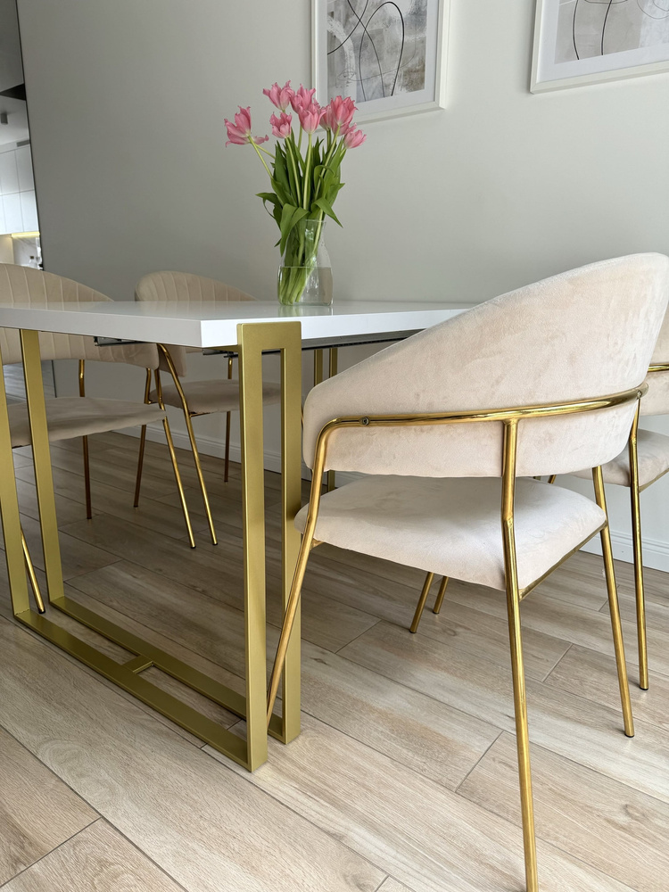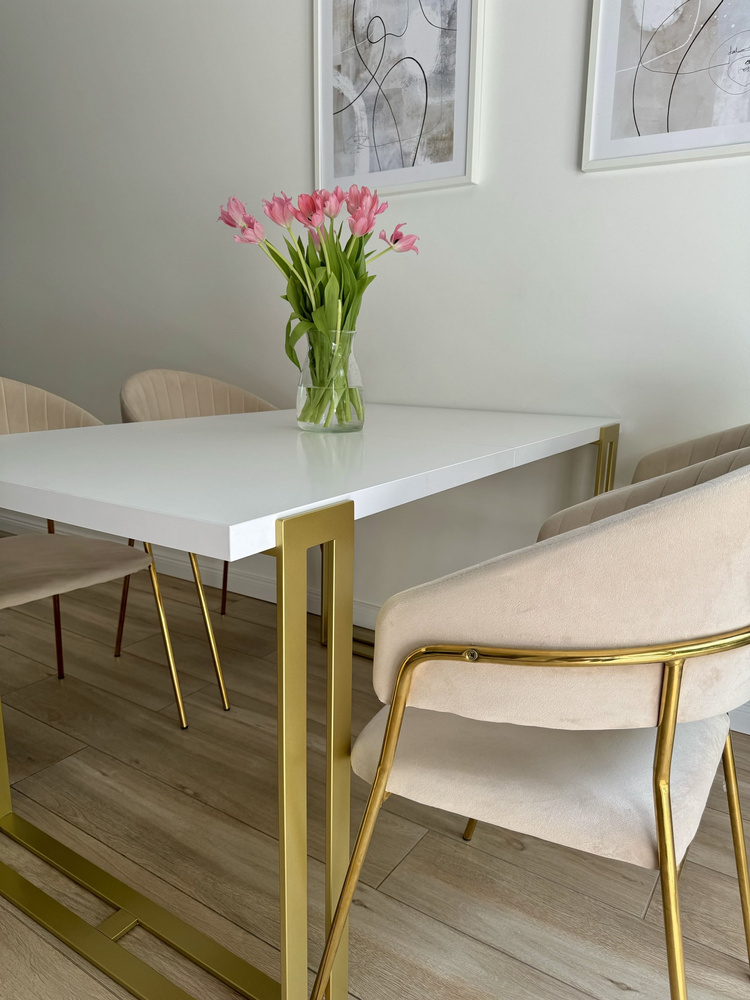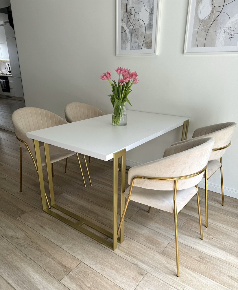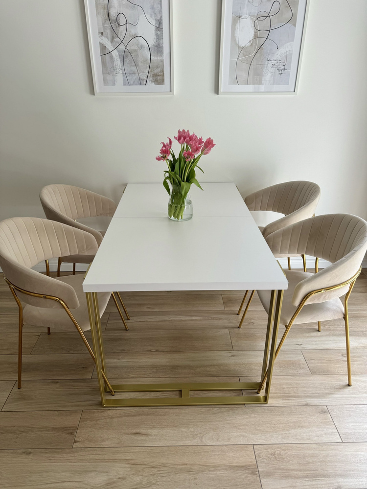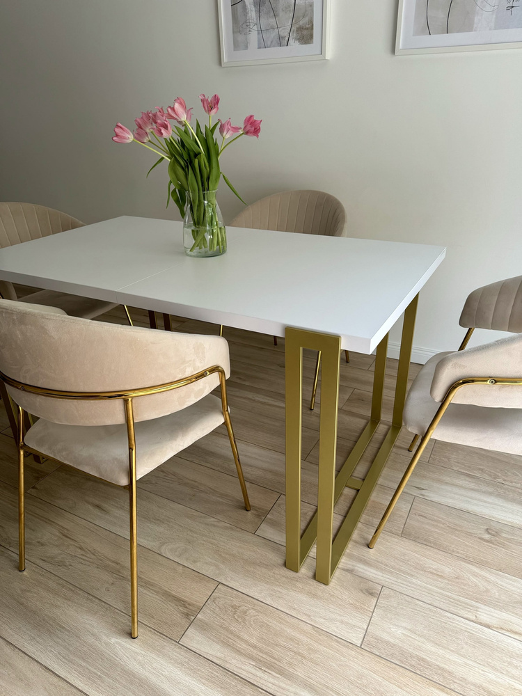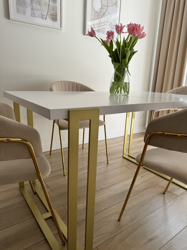 Ruokasali on kodin sydän, ja sen tärkein piirre on tietenkin ... pöytä! Joskus ei tarvita paljon, jotta sisustuksessa saadaan aikaan näyttäviä vaikutuksia. Tarvitset vain oikein valitun huonekalun, joka herättää kaikkien ruokasaliin tulevien huomion. Mikä on siis täydellinen pöytä? Suuri, tilava, kokoontaitettava, helppokäyttöinen, mutta tyylikäs ja varustettu mielenkiintoinen muotoilu. Vaatimuksia on monia, mutta meillä on malli, joka täyttää nämä odotukset. Puhumme HORTENista ruokapöytä. Tämä muotoilu tekee vaikutuksen ennen kaikkea suuri, valkoinen pöytälevy kauniilla kultaisilla jaloilla. Tämän ansiosta se erottuu edukseen paitsi toiminnallisuudellaan ja täydellinen laatu ammattitaidossa, mutta myös sen kauniissa ulkonäössä. Pöytälevyn pinta-ala on 160 / 260x90 cm. Lisäksi voit taittaa sen suurempaan kokoon milloin tahansa. Hamstraaminen ulosvedettävä pöytä kaksi 50 cm leveää sisäkettä. Tämän ansiosta voit suurentaa sitä jopa metrin verran ja sopii koko perheelle. Rakastatko myös pitkiä perheaterioita keittiön pöydässä, täynnä keskustelua, naurua ja herkullisia ruokia? Tämä laajennettava pöytä täyttää taatusti odotuksesi.