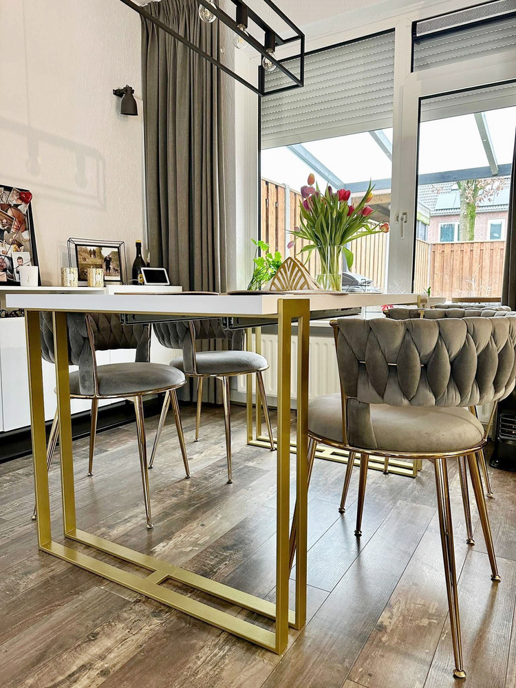 Modernit pöydät ovat ihanteellinen ratkaisu ihmisille, jotka haluavat yhdistää klassisen tyylikkyyden ja muotoilun. Sen minimalismi on omaperäistä, ja se muuttaa talon sisätiloja omaperäisellä tavalla antaen sille ajattoman tyylin. Rakenteen kultainen väri luo kauniin yhdistelmän pöytälevyn kanssa ja korostaa sen eleganssia. Jos siis olet modernin tai modernin tai lumoava sisustus, se on erinomainen val.