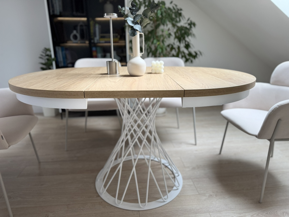 Gardino 100/140 cm -pöytä on ainutlaatuinen huonekalu, jossa yhdistyvät moderni muotoilu ja loft-tyylinen keveys. Pyöreä pöytälevy luonnollisessa tammisävyssä ulottuu 140 cm:iin, mikä tekee siitä täydellisen valinnan sekä jokapäiväiseen käyttöön että juhlatilaisuuksiin. Avoin, valkoinen metallijalka antaa sille keveyttä ja ainutlaatuisen tyylin. GARDINO sopii täydellisesti valoisisiin, kodikkaisiin sisustuksiin – sekä ruokasaliin että olohuoneeseen.