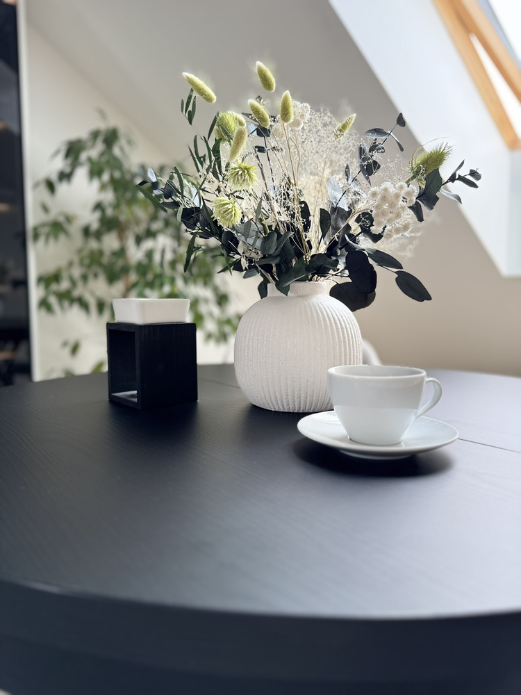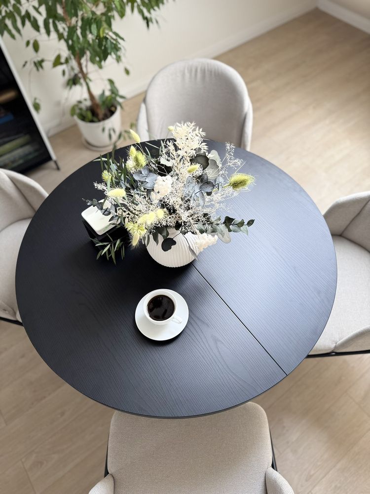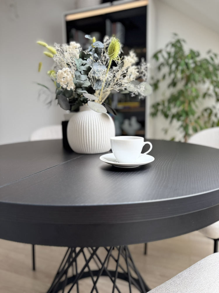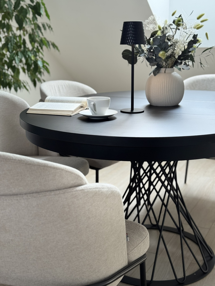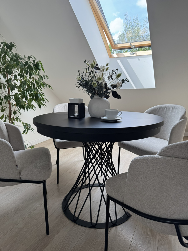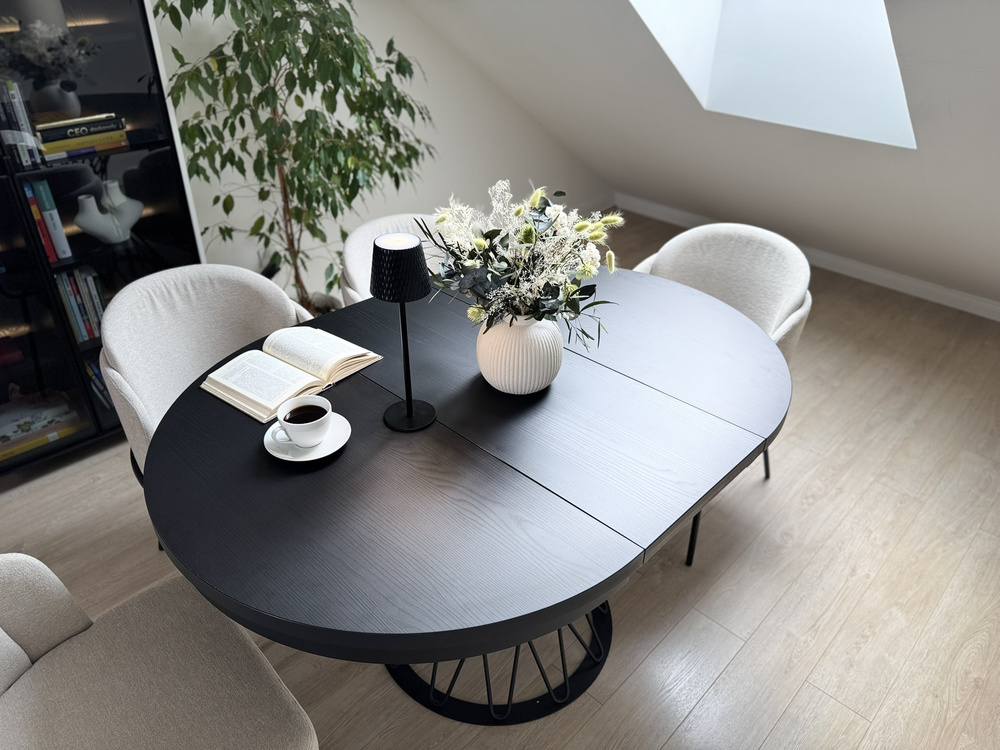 Kuvittele ilta kynttilänvalossa. Minimalistinen maljakko, hiljainen musiikki taustalla, kuppi teetä. Tämä pöytä on taustana rituaaleillesi – aamuisin ja iltaisin. Kun vieraat saapuvat, yksi liike riittää ja pyöreä pöytälevy laajenee 140 cm:iin, jolloin siihen mahtuu helposti 6 henkilöä. Entä päivittäisessä käytössä? Se vie vähän tilaa ja sopii täydellisesti olohuoneeseen, ruokailuhuoneeseen tai moderniin keittiöön.