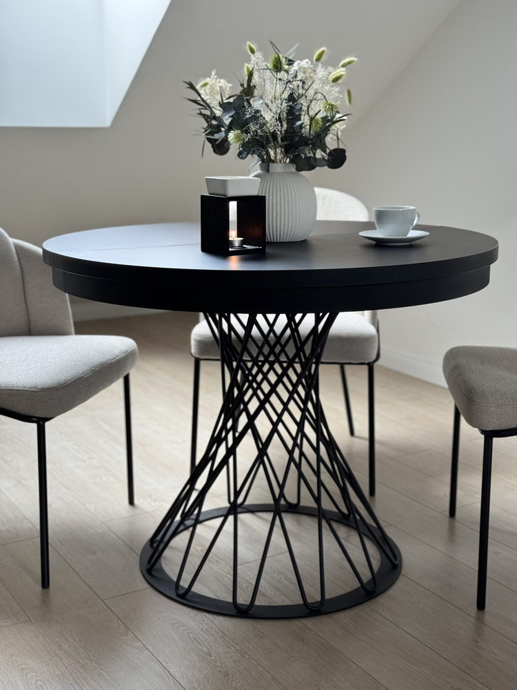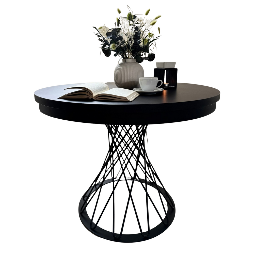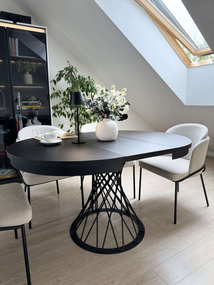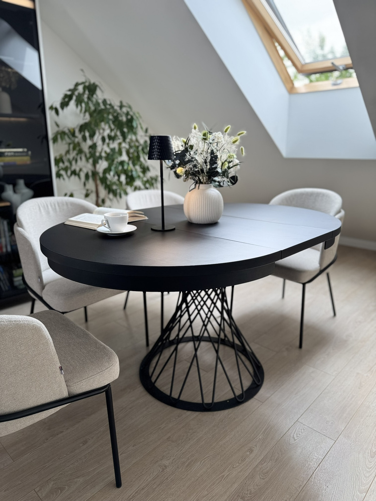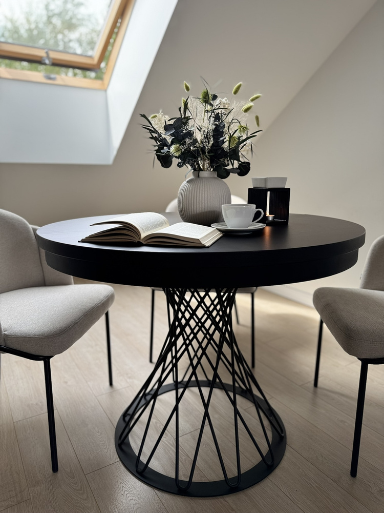 Gardino 100/140 cm -pöytä on ainutlaatuinen huonekalu, jossa yhdistyvät moderni muotoilu ja loft-tyylinen keveys. Pyöreä musta pöytälevy, jossa on näkyvä puukoriste, laajenee 140 cm:iin, mikä tekee siitä täydellisen valinnan sekä jokapäiväiseen käyttöön että juhlatilaisuuksiin. Avoin metallijalusta antaa sille keveyttä ja ainutlaatuisen tyylin.