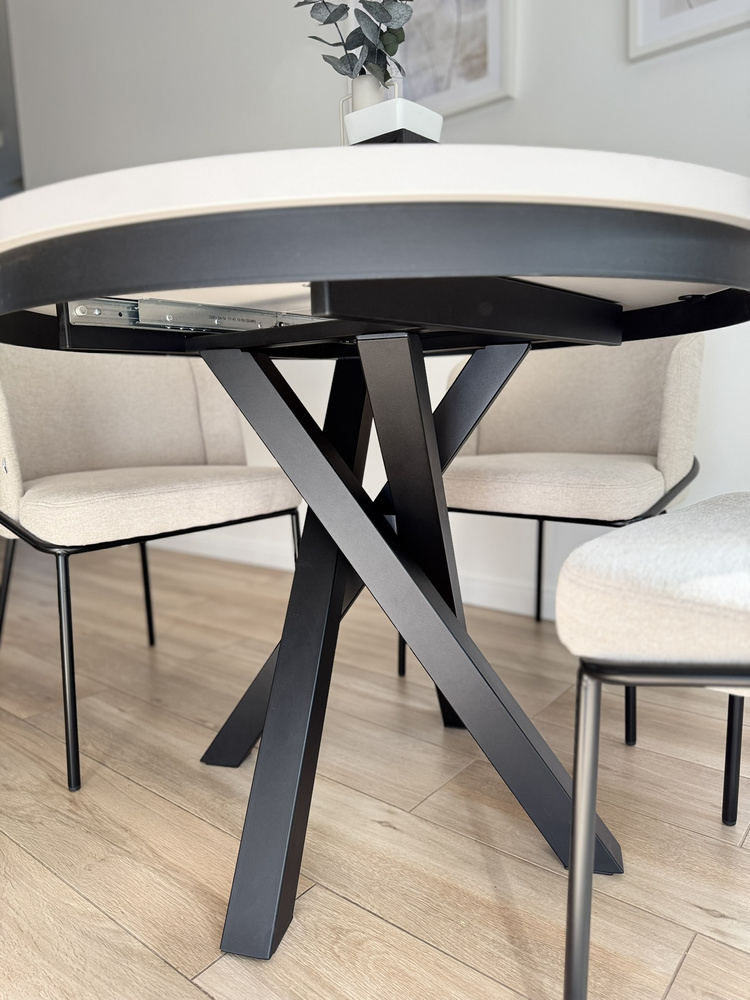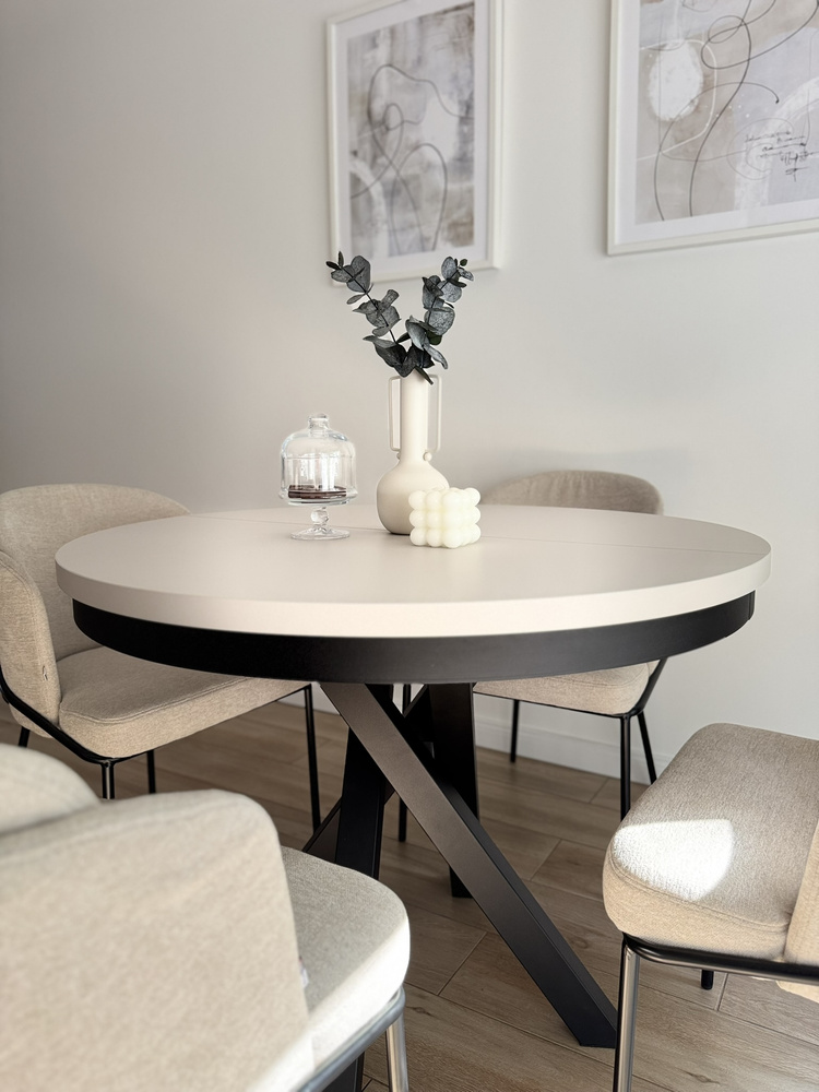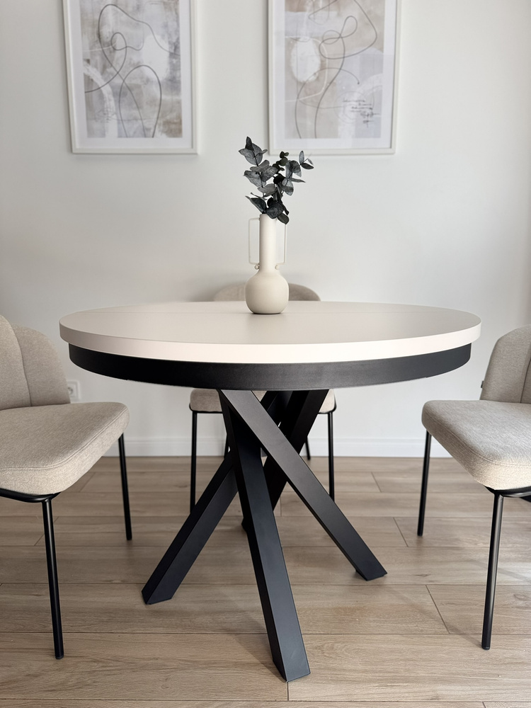 Tämä malli on ehdotus niille, jotka pitävät modernista mutta myös elegantista sisustuksesta. Pyöreä pöytä PASCAL 90–130 cm kashmir-värisenä ja mustalla metallijalustalla luo hienovaraisen kontrastin, joka sopii moderneihin, tyylikkäisiin ja loft-tyylisiin sisustuksiin. Pöytä ei ole liian massiivinen, mutta se herättää huomiota.