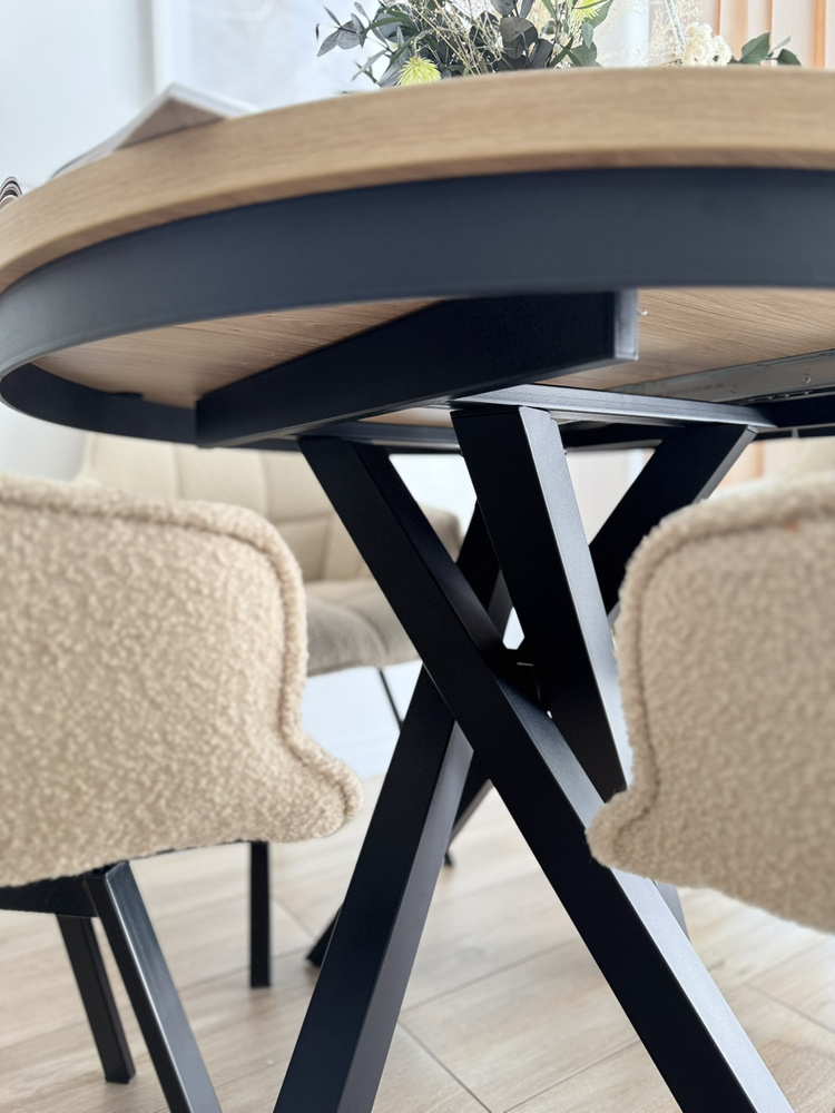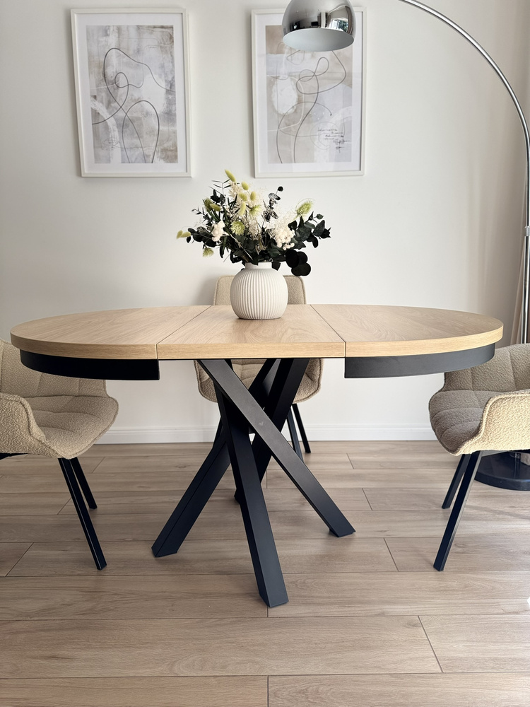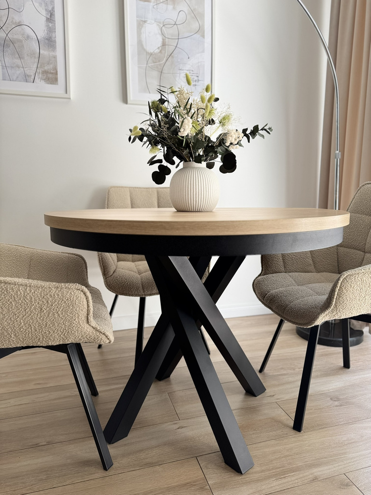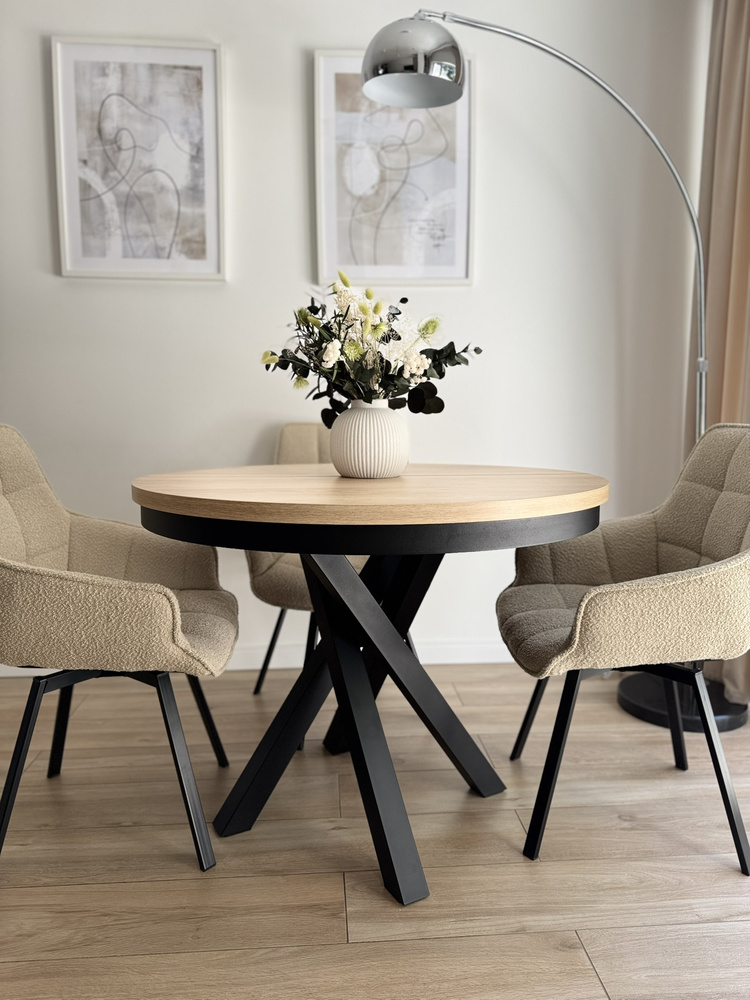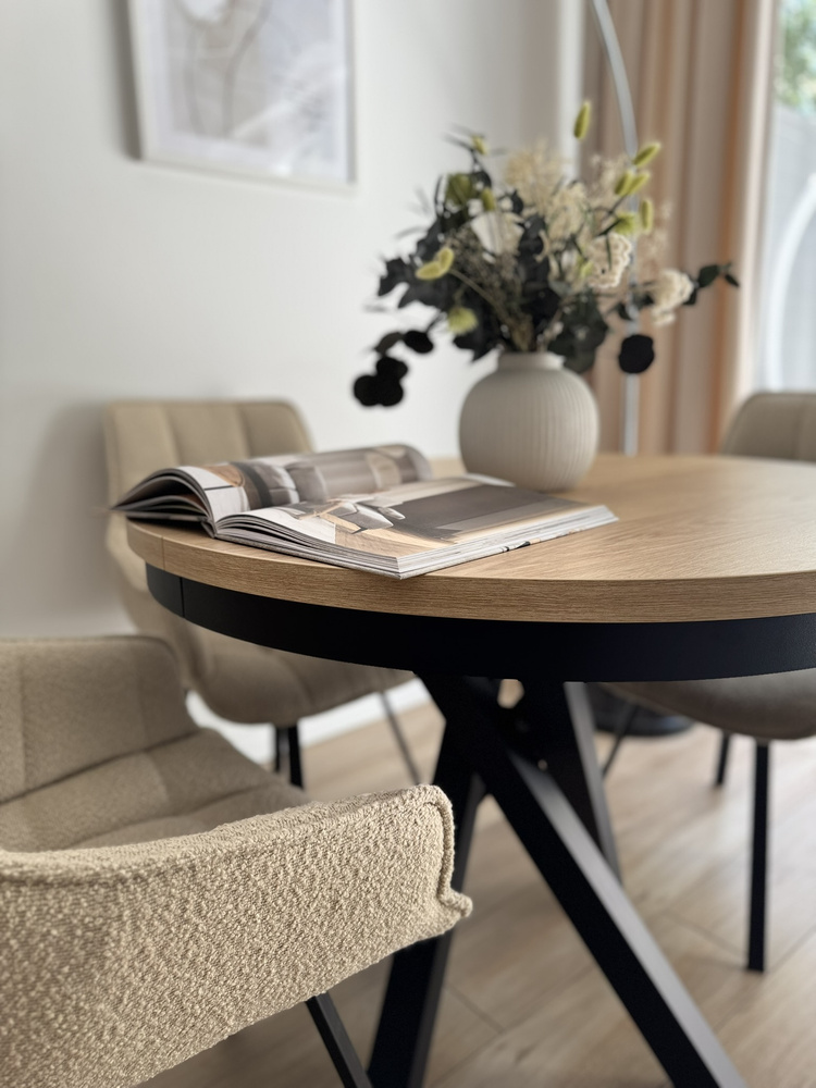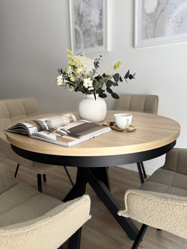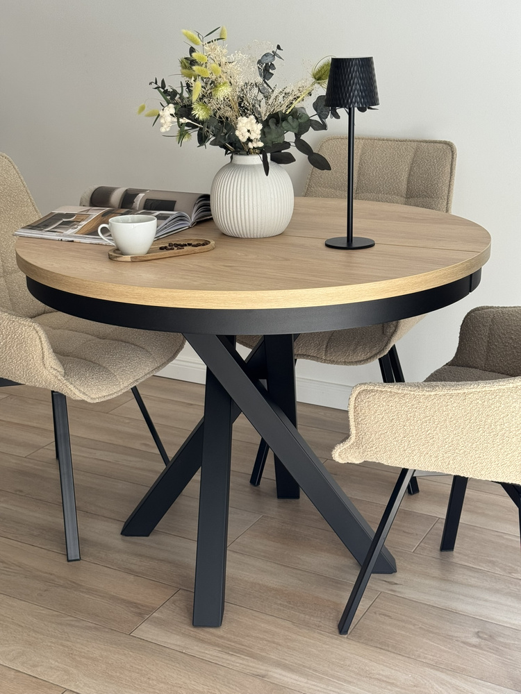 Tämä malli on ehdotus niille, jotka pitävät moderneista mutta lämpimistä sisustuksista. Pyöreä pöytä PASCAL 90–130 cm, jossa on luonnollisen hikora-tammipöytälevy ja musta metallijalka, yhdistää puun kodikkaan charmin ja teollisten yksityiskohtien selkeyden. Tämä huonekalu sopii erinomaisesti sekä tyylikkääseen ruokailuhuoneeseen että moderniin keittiönurkkaukseen.