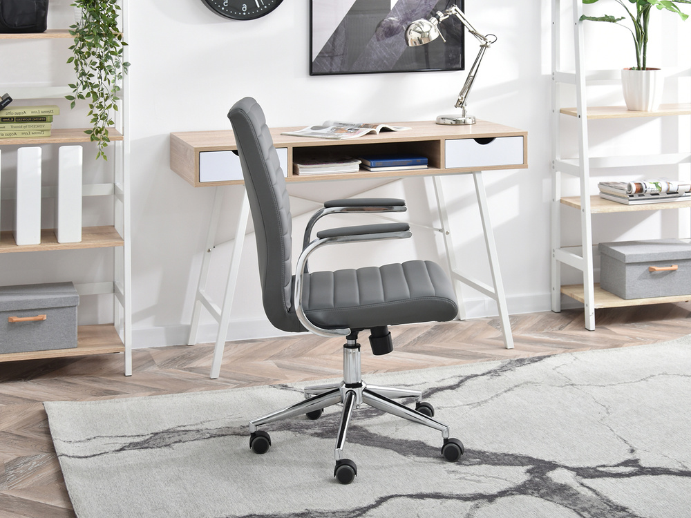 CRUZ-toimistotuoli ei ole vain toimiva, vaan myös esteettisesti miellyttävä. Sen harmaa väri istuin yhdessä kromattujen jalkojen kanssa muodostaa harmonisen kokonaisuuden, joka korostaa sisustuksen modernia luonnetta. Tukevan rakenteensa ja säädettävyytensä ansiosta tämä tuoli on täydellinen valinta kaikille, jotka haluavat yhdistää mukavuuden ja tyylikkyyden.